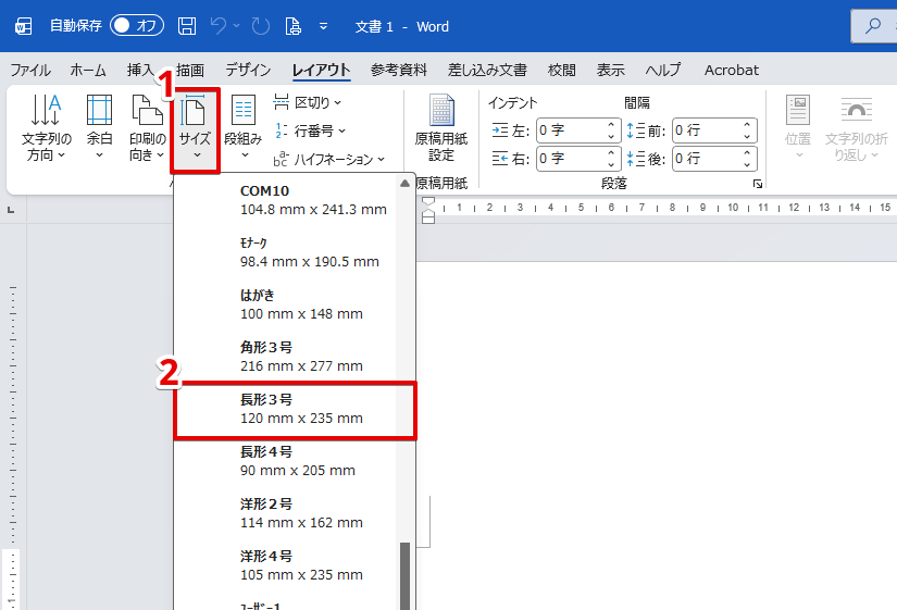 ↑最後に『サイズ』をクリック、スクロールして封筒のサイズを選びます。今回は長形3号を選択します。